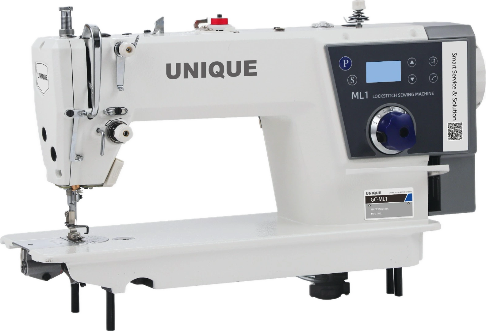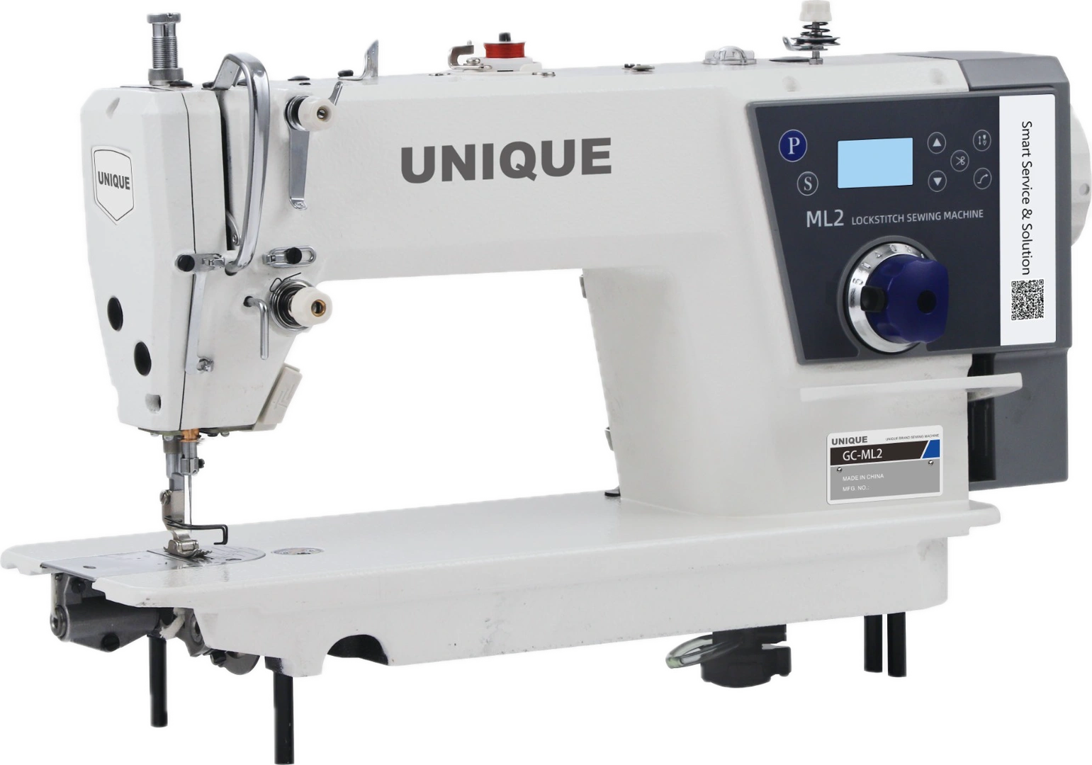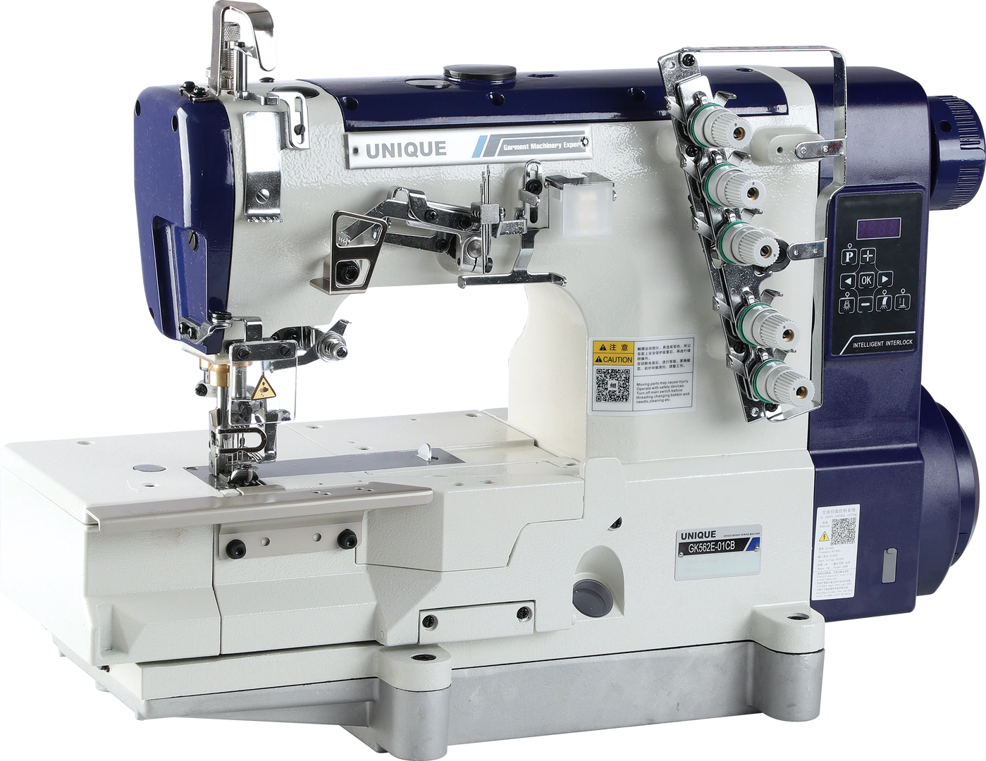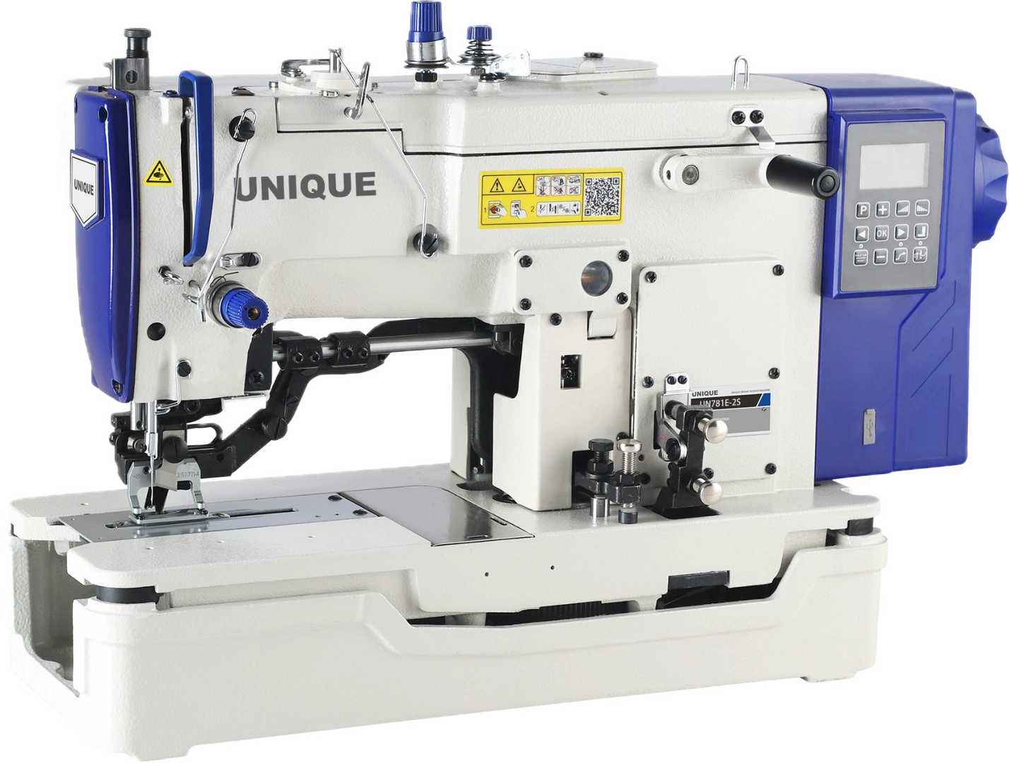 Egytűs nehéz árus tűtolásos huroköltésű ipari automata gyorsvarrógép, Európai állvánnyal, asztallappal. Energiatakarékos fejbe épített (direct drive) szervo motor, alsó-felső tűholtpont megállítás, rövid szálvágás (3mm), automata talpemelés, automata visszavarrás, etikett programok, program panel, központi zárt olajozás