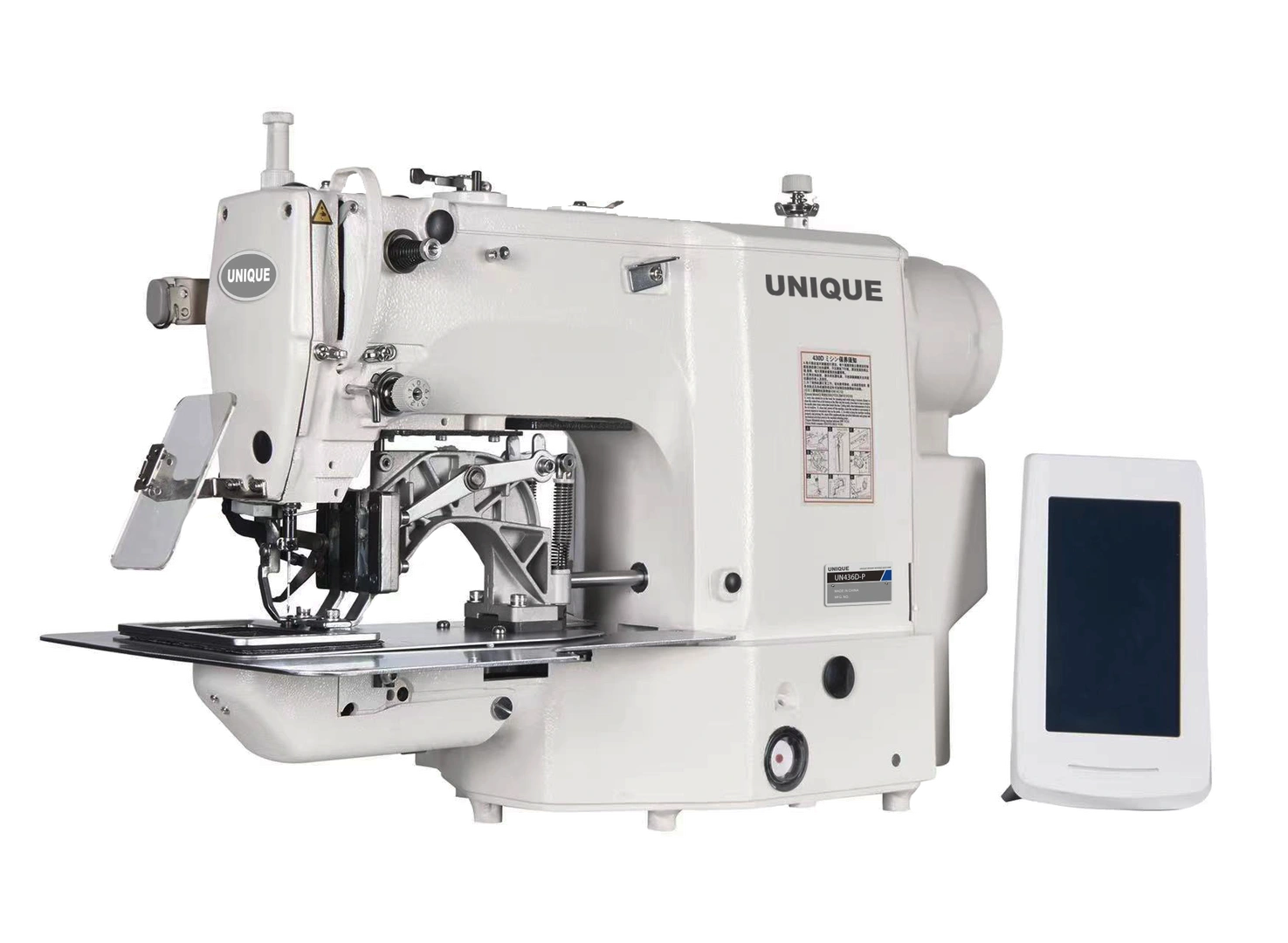 Automata elektronikus ipari területvarrógép. Érintőképernyős, programozható 100 programmal, fejbe épített energiatakarékos (direct drive) szervo motor, kétszálas huroköltés, központi olajozással, 90x60mm felületen tetszőleges varrat, beépített programozóval.
